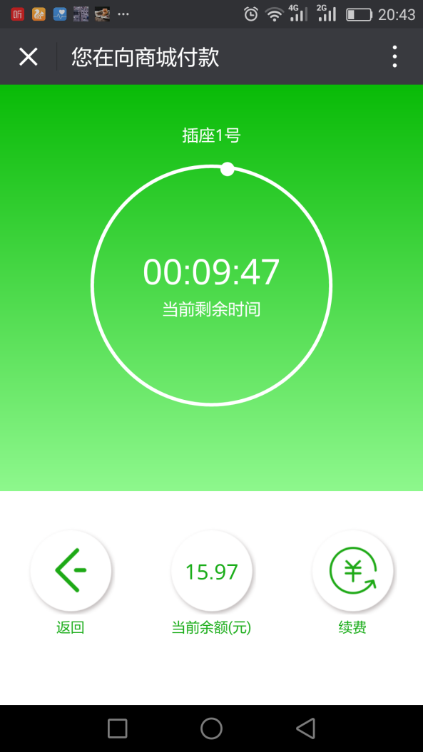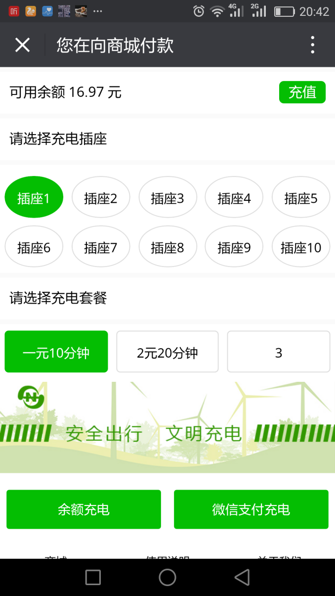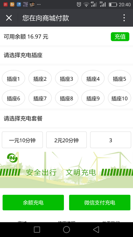 5.微信支付可顯示可用余額。并返回到充電界面進行充電。